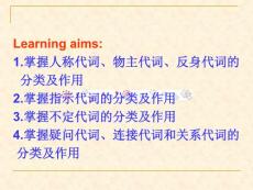 - 第三讲代词 代词是在句中代替名词或相当于名词的词、词组、短语或句子的词。大多数代词具有名词或形容词的功能。英语中的代词,按其意义、特征及在句中的作用分为:人称代词、物主代词、反身代词、指示代词、不定代