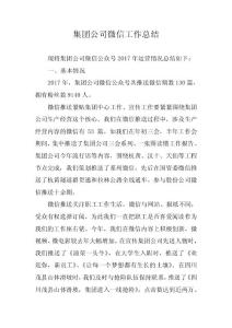 集团公司微信工作总结现将集团公司微信公众号2017 年运营情况总结如下: 一、基本情况 2017 年,集团公司微信公众号共推送微信期数130 篇,拥有粉丝数9140 微信推送紧贴集团中心工作。宣传工作