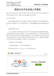 医学贴近生活专业塑造美丽 深圳市医莱美思科技有限公司 微信公众平台快速上手教程 微信公众平台快速上手教程,转载自刘子骏博客。内容主要为微信公众平台相关内容,包括微信公众平台登陆、微信公众平台认证、微信
