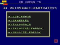 4.1混凝土及钢筋混凝土工程基本要点及有关公式4.1.1 定额子目的划分依据按不同的施工方法划分子目现浇钢筋混凝土;预制钢筋混凝土:现场预制、加工厂预制(二者区别:“加工厂预制”的情况必须另计预制构件