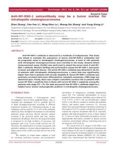 anti-ny-eso-1 autoantibody may be a tumor marker for intrahepatic cholangiocarcinoma.[2017][oncotarget][10.18632oncotarget.22464]
