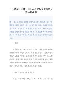 一卡通解决方案-LD3320的嵌入式语音识别系统的应用 要:语音交互系统是比较人性化的人机操作界面,它需要语音识别系统的支持。LD3320就是这样一款语音识别芯片。介绍了该芯片的工作原理及应用,给出了