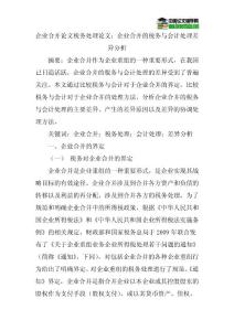 企业合并论文税务处理论文:企业合并的税务与会计处理差异分析摘要:企业合并作为企业重组的一种重要形式,在我国已日趋活跃,企业合并的税务与会计处理的差异受到了普遍关注。本文通过比较税务与会计对于企业合并的