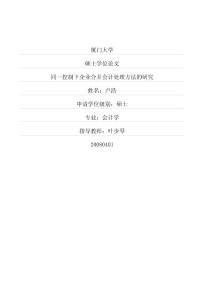 厦门大学硕士学位论文同一控制下企业合并会计处理方法的研究姓名:卢浩申请学位级别:硕士专业:会计学指导教师:叶少琴20080401摘要在全球并购浪潮风起云涌的背景下,我国企业合并也热潮高涨。但与西方国家