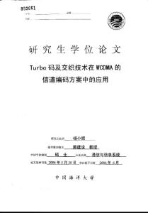 - 939661r;DC密级研究生学位论文Turbo码及交织技术在WCDMA的信道编码方案中的应用研究生姓名扬!j!龌指导教师姓名熊建遮煎攫申浔学位级别砸 专业名称通焦与蝗皇丕缝论文答辩只期2Q鱼垒生月3
