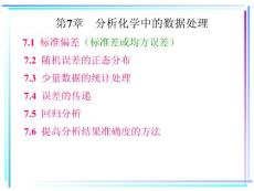 第7章分析化学中的数据处理7.1 标准偏差(标准差或均方误差)7.2 随机误差的正态分布7.3 少量数据的统计处理7.4 误差的传递7.5 回归分析7.6 提高分析结果准确度的方法几个概念(术语)1、