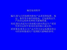 偏差处理程序偏差:指与已经批准的影响产品质量的标准、规定、条件等不相符的情况,它包括药品生产的全过程和各种相关影响因素。变更:指以改进为目的而提出的对药品生产质量管理全过程中某项内容的修订或完善。质量