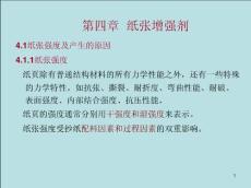 1第四章纸张增强剂4.1纸张强度及产生的原因4.1.1纸张强度纸页除有普通结构材料的所有力学性能之外,还有一些特殊 的力学特性。如抗张、撕裂、耐折度、弯曲性能、耐破、 表面强度、内部结合强度、抗压性能