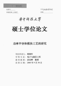 分类0——学校代码j旦!旦L学U-垒业丛垦!盟密绒辜中铆长大署硕士学位论文功率半导体模块工艺的研究学位申请人学科专业指导教师答辩日期周现军电子与通信工程余岳辉教授2005年9月30日华中科技大学硕士学