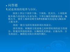 问答题1.试述颈部的境界与分区。颈部上界以下颌骨下缘、下颌角、乳突尖、上项线和枕外隆凸的连线与头部为界;下界以胸骨颈静脉切迹、胸锁关节、锁骨上缘和肩峰至第7颈椎棘突的连线与胸部和上肢为界。颈部一般分为