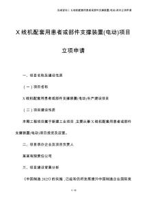 X线机配套用患者或部件支撑装置(电动)项目立项申请一、项目名称及建设性质(一)项目名称X线机配套用患者或部件支撑装置(电动)生产建设项目(二)项目建设性质本期工程项目属于新建工业项目,主要从事X线机配