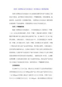 美国《消费品安全改进法》对童装出口的影响。美国《消费品安全改进法》对儿童服装及鞋等多类产品制定了新的安全要求,这些要求主要涉及邻苯二甲酸酯限制、含铅量限制、追踪标签、认证及第三方检测及罚款。《消费品安全改进法》新要求将对童装将产生深远影响,需要我国出口企业予以高度关注。
