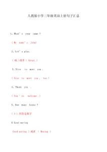 人教版小学三年级英语上册句子汇总1、What’s your name Myname’s John) 2、Let’s play. OK.)或者(Great.) 3、Nice meetyou meetyo