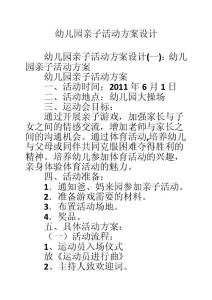 - 幼儿园亲子活动方案设计幼儿园亲子活动方案设计(一):幼儿园亲子活动方案 幼儿园亲子活动方案 一、活动时间:2011 二、活动地点:幼儿园大操场三、运动会目标: 通过开展亲子游戏,加强家长与子女之间的情