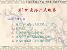 2009-11-41第1章最终开采境界本章主要内容1. 露天开采境界定义及其确定/计算2. 剥采比3. 经济合理剥采比及其确定4. 露天开采境界构成要素及其确定5. 露天矿开采终了平面图的绘制金属矿床