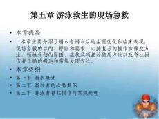 本章提要•本章主要介绍了溺水者溺水后的生理变化和临床表现,现场急救的目的、原则和要求,心肺复苏的操作步骤及方法,颈椎受伤的原因、症状及颈托的使用方法以及脊柱损伤者正确的搬运和常规处理方法。• 本章提纲