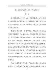 XXXXXX大学学士学位论文 随着女性文化水平和社会地位的逐步提升,女性在消费社会中逐渐占据重要地位,女性自主消费时代随之到来。白领女性作为职业女性中的高消费群体,以她们强大的消费潜力迅速占据市场。本