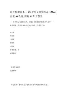 - 综合模拟某男士45 岁外企白领身高 170cm体重92 公斤,烟龄20 年含答案 ——文章均为WORD 文档,下载后可直接编辑使用亦可打印—— 单选题第1 题按照身高体重情况,该男士体重属于( A.正