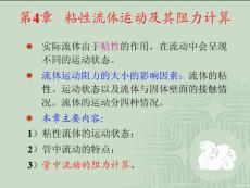 第4章粘性流体运动及其阻力计算 实际流体由于粘性的作用,在流动中会呈现 不同的运动状态。 流体运动阻力的大小的影响因素:流体的粘 性、运动状态以及流体与固体壁面的接触情 况。流体的运动分四种情况。 本