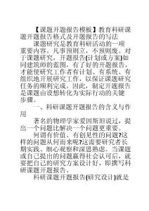 - 【课题开题报告模板】教育科研课题开题报告格式及开题报告的写法课题研究是教育科研活动的一项重要内容。凡事预则立,不预则废。对于课题研究,开题报告(计划或方案)如同建筑师的蓝图,有了好的开题报告,才能使研