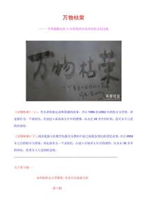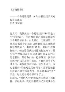 《万物枯荣》——一个普通股民15 年炒股经历及其对股市的浅见 作者/雷立刚 前几天,我偶然读到了本论坛ID“黑色人生”发的帖子,由人及己,无限感慨,于是决定来此注册,也发个讲述自己炒股经历及交流炒股思