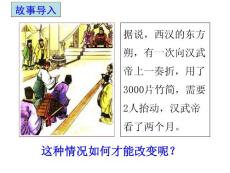 故事导入据说,西汉的东方朔,有一次向汉武帝上一奏折,用了3000片竹简,需要2人抬动,汉武帝看了两个月。人教新版七年级历史上册学习目标1、识记造纸术的发明及其伟大意义。2、知道张仲景和华佗对中医学的贡