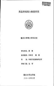 - 药品市场准入制度研究重庆大学博士学位论文 学生姓名:蒋慧 指导教师:许明月 教授 专业:环境与资源保护法学 学科门类:法学 重庆大学法学院 二O—O年十月Research DrugMarket Acc