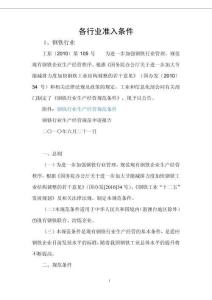 - 各行业准入条件1、钢铁行业 工原〔2010〕第 105 为进一步加强钢铁行业管理,规范现有钢铁企业生产经营秩序,根据《国务院办公厅关于进一步加大节能减排力度加快钢铁工业结构调整的若干意见》(国办发〔2