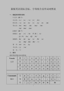 新版英语国际音标、字母组合及单词对照表一、新版英语国际音标 1.元音(20 /tr/浊辅音:/b/ /dz//dr/ 二、新旧新旧英语国际音标对照表 Vowels 元音 eIaI eiai Conso