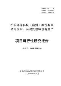 证书编号:11420060063发证机关:国家发改委 护航环保科技(宿州)股份有限公司废水、污泥处理等设备生产 工程号:HQSL8101230 安徽环球工程咨询有限公司 二〇一一年五月 护航环保科技(