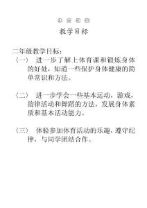 教学目标二年级教学目标: 体育课教学常规体育课教学应从增强学生体质出发,并经常对学生进行思想品德教育,有意识地培养学生各种优良品质,充分发挥教师和学生两个方面的积极性,不断提高教学质量。 要爱护体育器
