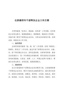 石排镇领导干部帮扶企业工作方案为贯彻镇委“扶项目、稳基础、放发展”工作思路,切实帮扶企业度过难关,做稳做强做大,根据镇委、镇政府工作部署,我镇开展了领导干部帮扶企业活动。为保证活动顺利开展,取得成效,