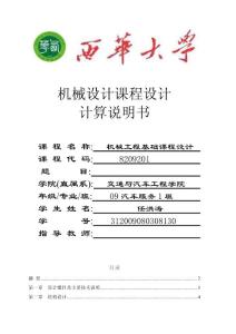 机械设计课程设计计算说明书 学院(直属系):交通与汽车工程学院 年级/专业/班: 09汽车服务1班 第一章设计题目及主要技术说明 第二章结构设计 452.1 传动方案拟定 2.2电动机选择 2.3确定