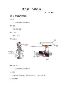 知识点:一、凸轮机构的组成和应用 教学目标: 热爱机加行业 教学工具: 教案、课本 导入知识点: 讲解知识点: 一、凸轮机构的组成和应用 1、组成 凸轮机构是由凸轮、从动件和机架三个部分所组成。 2、