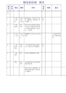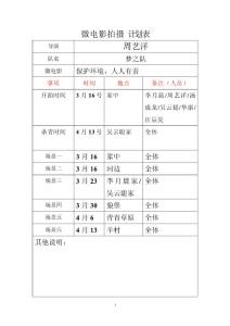 微电影拍摄计划表 导演 队名梦之队 微电影 保护环境,人人有责 事项 时间 地点 备注(人员) 开拍时间 全体场景一 月16家中 全体 场景二 月16河边 全体 场景三 全体场景四 全体场景五 青青