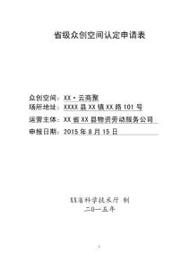 省级众创空间认定申请表众创空间:XX云商聚 场所地址:XXXX 县XX 镇XX 路101 运营主体:XX省XX 县物资劳动服务公司 申报日期:2015 众创空间名称XX云商聚 成立时间 2014年10