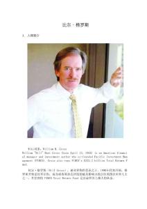 比尔格罗斯1.人物简介Wiki词条:William H. Gross William "Bill" Hunt Gross (born April 13, 1944) Americanfinancial