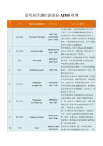 常用润滑油检测国标-ASTM对照编号 项目 Test parameters 标准方法 标准方法概要 运动粘度Kinematic Viscosity GB/T 265 ASTM D445 GB/T 11